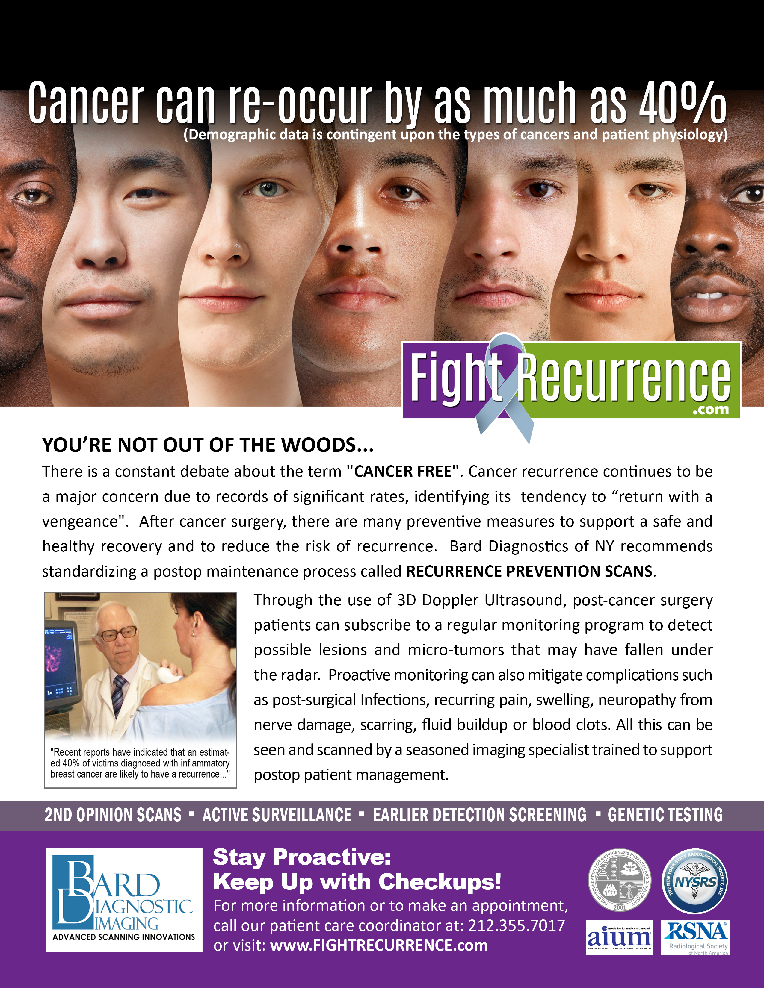 To be safe, it is suggested to look upon the first bout with cancer as a signal to be VIGILANT ABOUT CANCER RE-OCCURRING, whereby CANCER RECURRENCE has a tendency to happen with a vengeance. Where deadly METASTASIS is the ultimate enemy of it all, global cancer awareness needs an upgrade in its message. The NY Cancer Resource Alliance offers a proactive strategy dedicated to "Getting Checked Now!" and KEEPING IT AWAY with prevention programs and life-saving resources. "Fight Recurrence" was originally launched within the firefighter community in NYC (9/11 responders) and has proven effective to battle re-occurrence and potential metastasis. see: www.healthscannyc.org