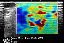 Oftentimes, mammography gets false negatives when scanning dense breast tissue. Because dense breast tissue appears white on a mammogram, it cloaks posssible tumors behind it- deeming the mammogran unreliable. The two forms of breast density is either FIBROCYSTIC or GLANDULAR tissue. Through ultrasound, we can check for tumors easily through fibrotic dense breasts because it stands out as a black region (or a black hole) within the white area. As shown in Image 3, a black hole could get lost, making it more difficult to image this type of dense breast. In this case, a solution is the use of elastography, which offers visual confirmation as indicated by color data. Elastography can measure tissue density (its hardness or elasticity) within the glandular breast tissue. . [see complete report)